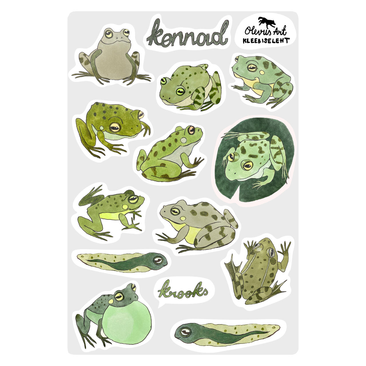 Lehel on 12 KRISTEL SERGO joonistatud konnaga kleebist ja lisaks ka sõna "konnad" ja "krooks" on kleebis.