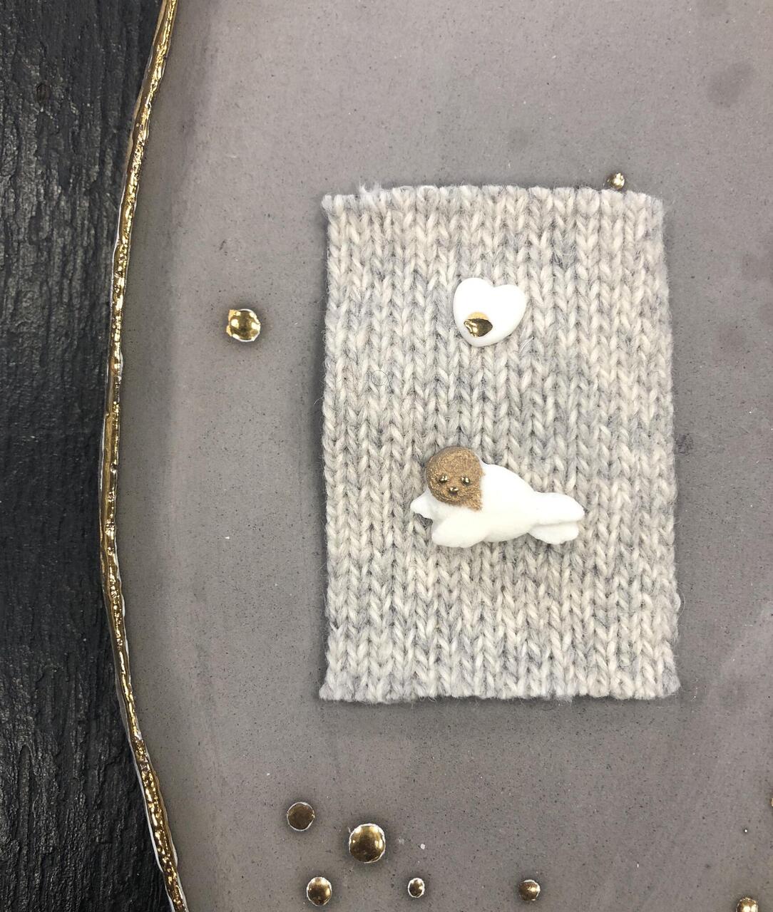 Valgest portselanist ehtsa kullaga kaunistatud tilluke hülgepross, komplektis väikese südamega.