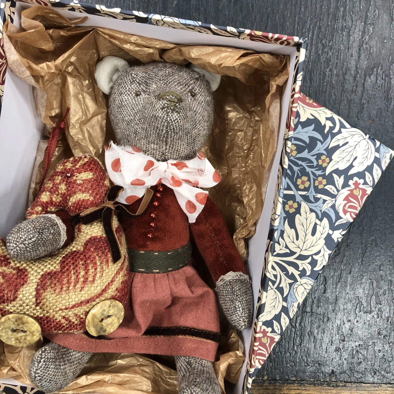 Ilusate detailidega tekstiilist karu koos väikese hanepojaga.