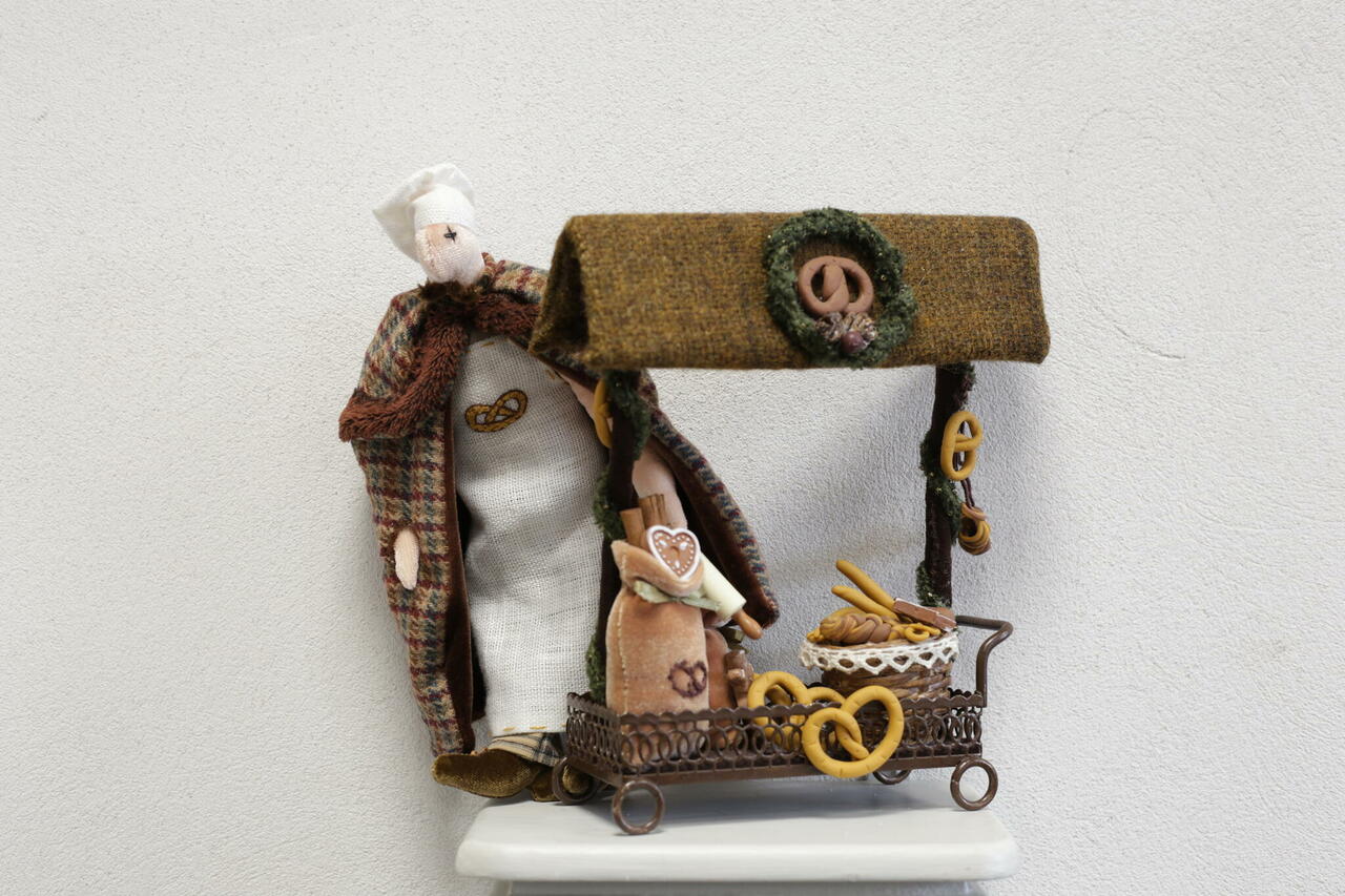 Jõuluhõnguline ja detailirohke saiakäru nukumängudeks või dekoratsiooniks.