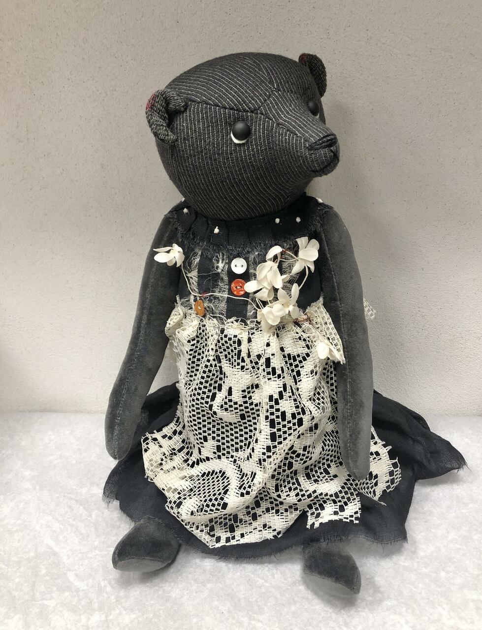 Materjalideks puuvill, samet, klaassilmad. Täidetud saepuru ja puupõhuga.