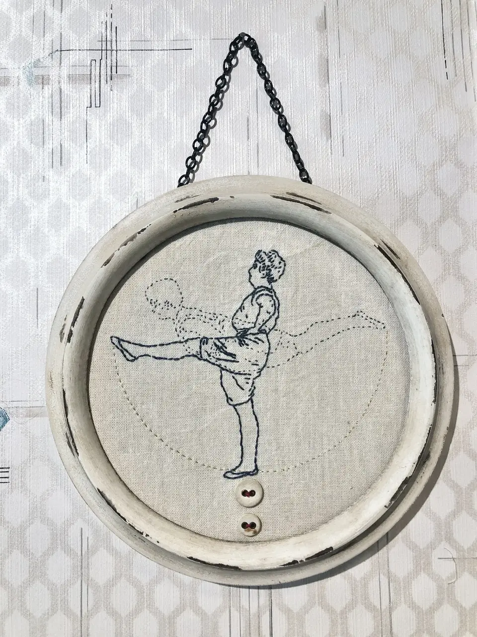 Sinine ja kuldne tikand, taimedega värvitud puuvillane vintage kangas, vintage pesunööbid, vintage puidust pildiraam