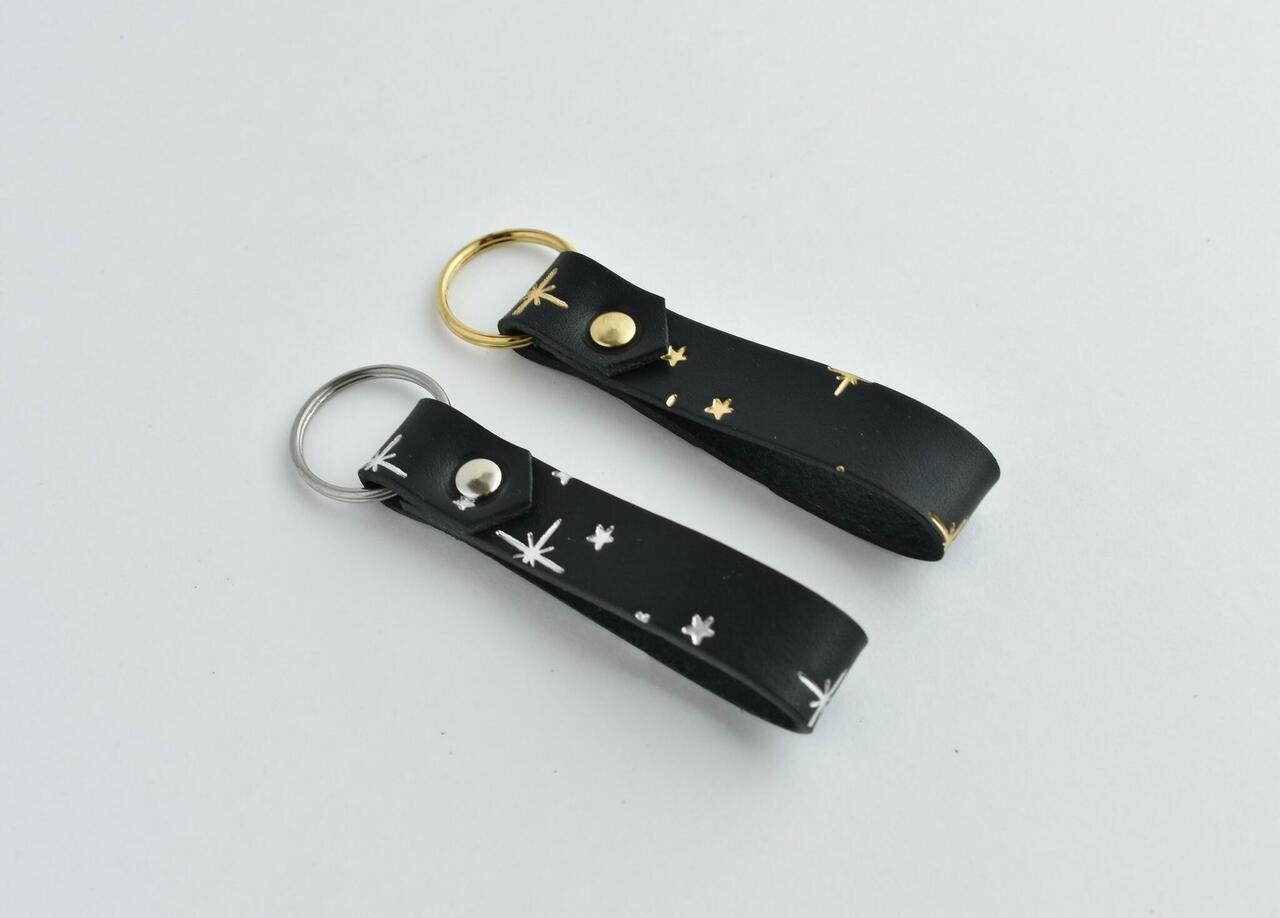 Vegetable tanned leather keychain with a gold or silver star pattern.Made of vegetable tanned leather from Italy, the tanning process of which is being monitored strictly to ensure excellent skin quality and environmentally friendly production.